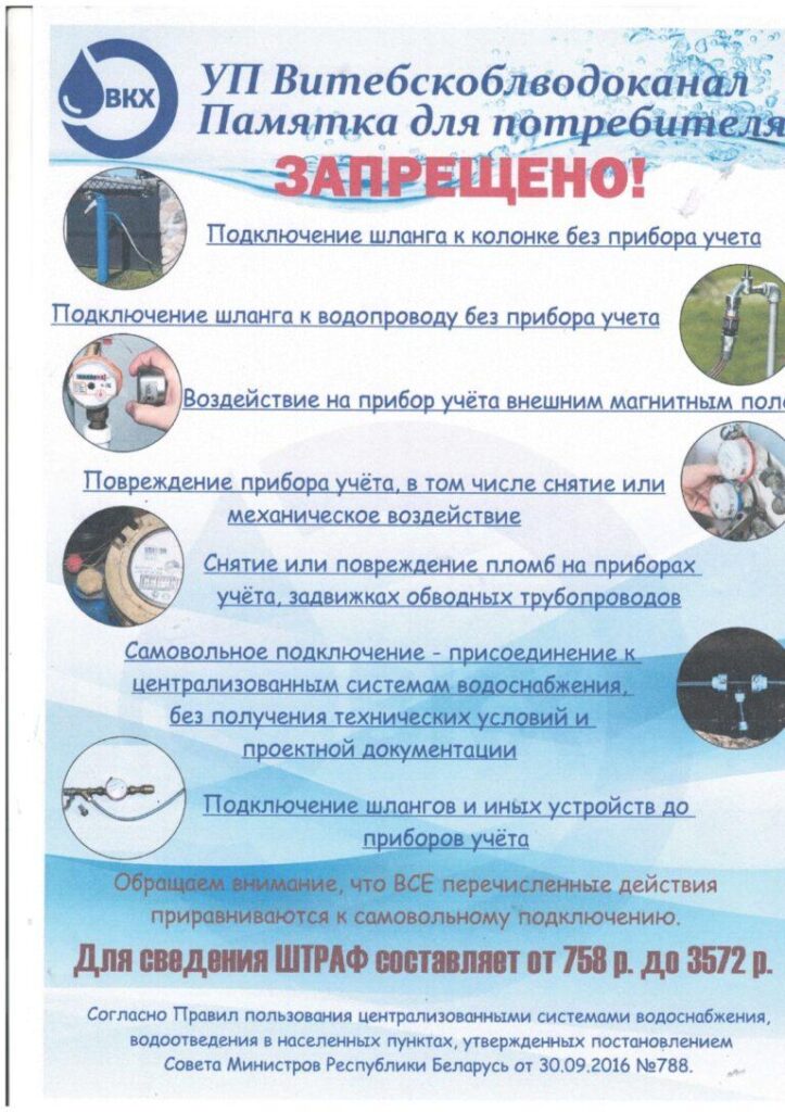 Последствия при нарушении Правил пользования централизованными системами водоснабжения, водоотведения (канализации) в населенных пунктах!\"\"В связи с участившимися случаями выявления нарушений Правил пользования централизованными системами водоснабжения, водоотведения (канализации) в населенных пунктах, утвержденных постановлением Совета Министров РБ 30.09.2016 № 788 (далее Правила), Филиал «Оршаводоканал» напоминает, что согласно п.53.5 Правил запрещено подключение шлангов к уличным водоразборным колонкам, водопроводам в доме и на участке до прибора учета расхода воды (счетчика), а также при отсутствии прибора учета. Расчет объемов потребления воды при самовольном подключении к системам водоснабжения производится в соответствии с пунктом 52 Правил —  по  пропускной способности водопроводного ввода (подключения) при скорости воды в нем 2 м/с и действии его полным сечением в течении 24 часов в сутки в течение 30 дней.